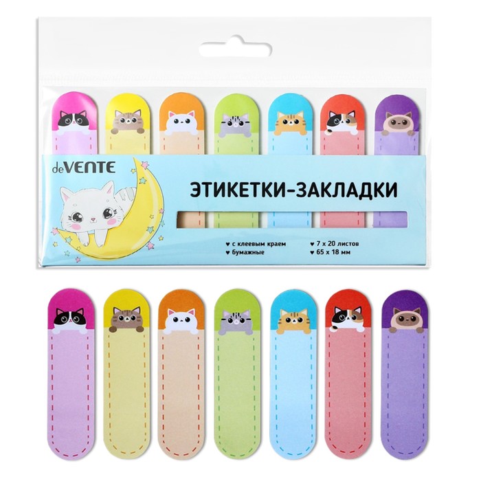 Закладки с клеевым краем 18 х 65 мм, 7 цветов по 20 листов, , бумажные, deVENTE Kitty, пластиковый пакет с евпроподвесом