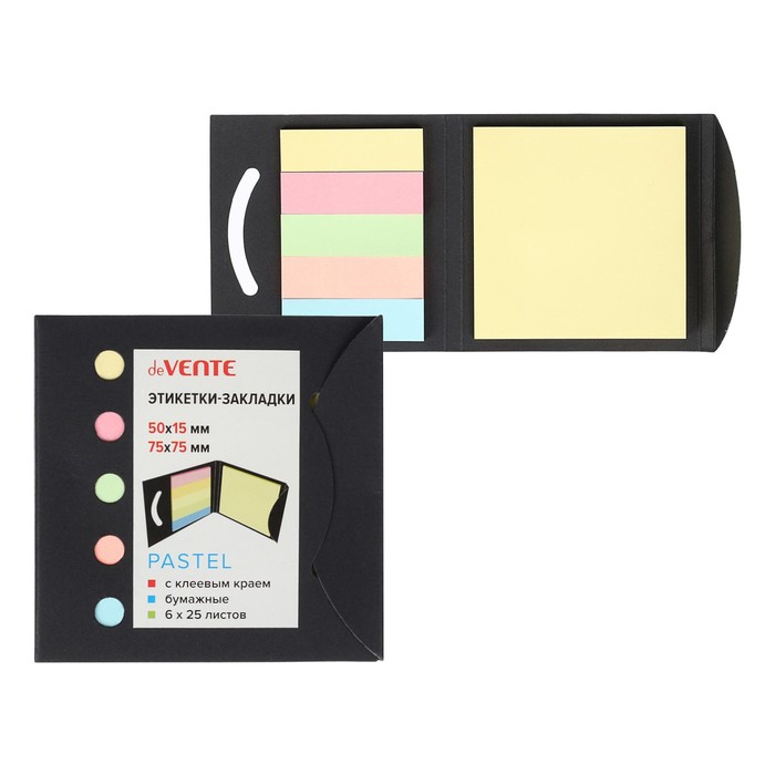 Закладки с клеевым краем (стикеры) 15 х 50 мм/75 х 75 мм, 6 цветов по 25 листов, бумажные, deVENTE Pastel, крафтовая упаковка