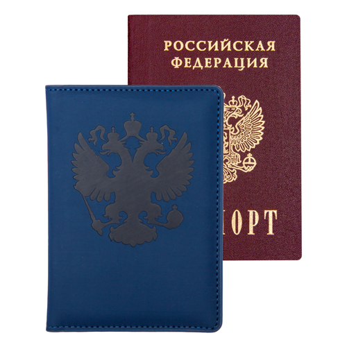 Обложка для паспорта " deVente " 10*14см искусственная кожа Герб, синяя, поролон, термотиснение, отстрочка, 3 отделения для визиток, пластиковый пакет, европодвес