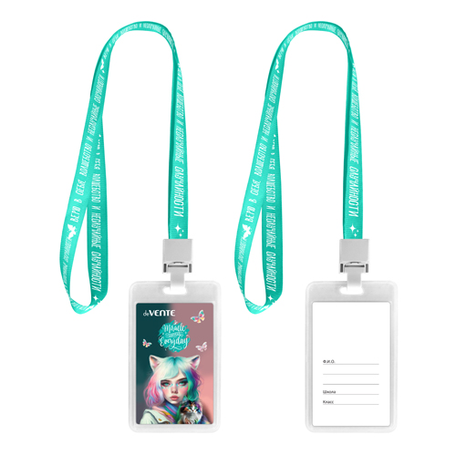 Бейдж " deVente " 112*70мм, Miracle, вертикальный, прозрачный, ПВХ, на цветной ленте с принтом, с пластиковой клипсой