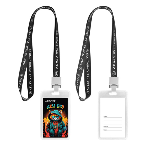 Бейдж " deVente " 112*70мм, Hey Bro, вертикальный, прозрачный, ПВХ, на цветной ленте с принтом, с пластиковой клипсой