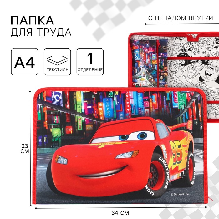 Папка для труда А4 с пеналом, на молнии, текстиль, Тачки