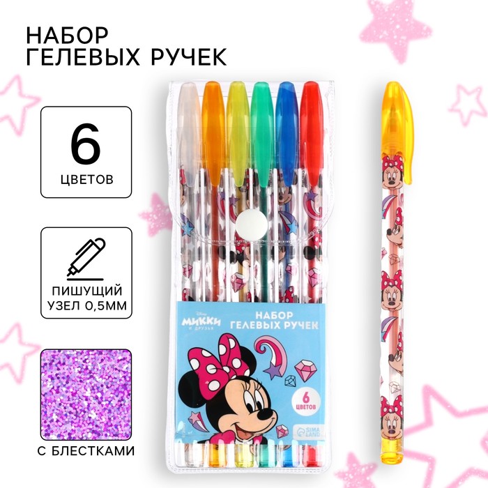 Набор гелевых ручек с блёстками, 6 цветов, Минни Маус