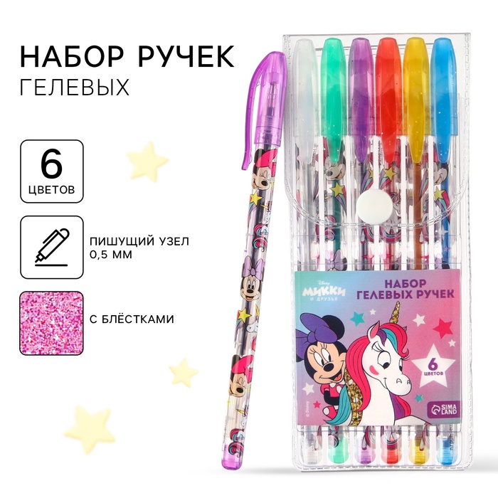 Набор гелевых ручек с блёстками, 6 цветов, Единорог, Минни Маус