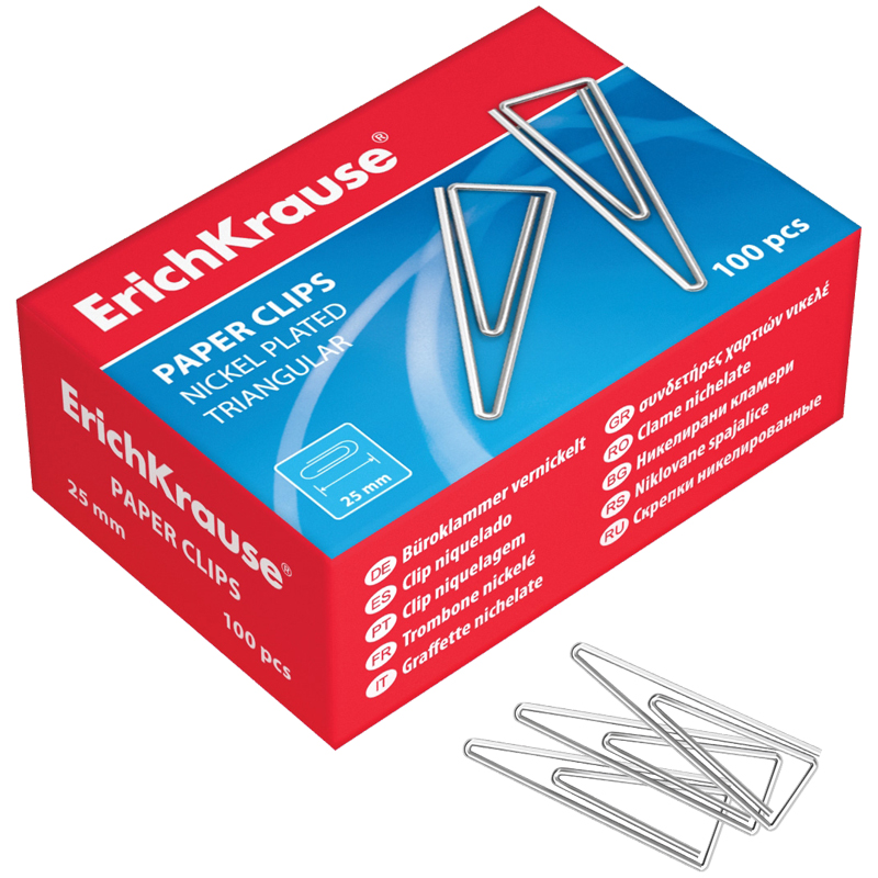 Скрепки 32мм, Erich Krause, 100шт., никелированные треугольные, карт. упак.