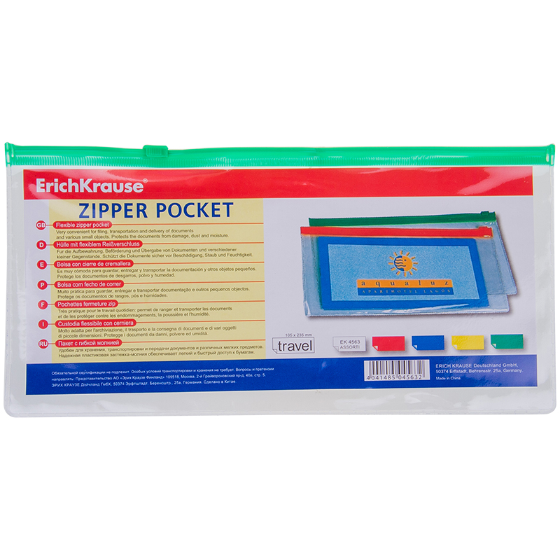 Папка-конверт на молнии Erich Krause "Zip Travel", 255*130мм, 140мкм, прозрачная