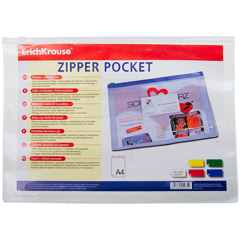 Папка-конверт на молнии Erich Krause "PVC Zip Pocket", А4, 140мкм, прозрачная
