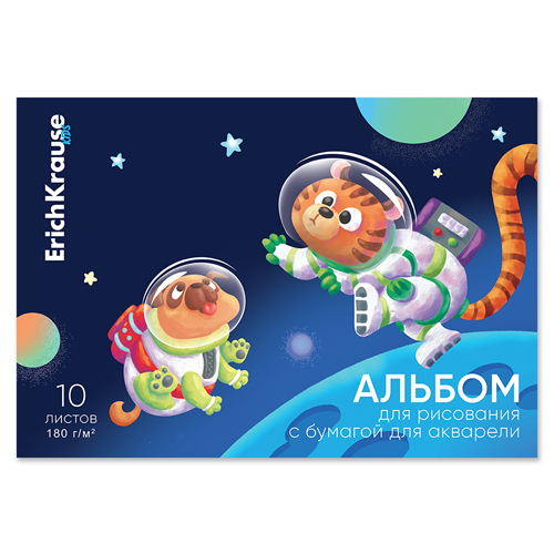 Альбом А4 10л жесткая подложка склейка " ErichKrause " Space Animals с бумагой для акварели, обложка- мелованный картон, блок- офсет 180 г/м2