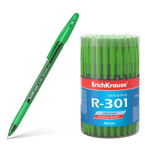 Ручка шариковая " Erich Krause " R-301 Original Stick&Grip зеленая 0,7мм, шестигранная, резиновый держатель, тонированный корпус, толщина письма 0,35мм, в пластиковом тубусе