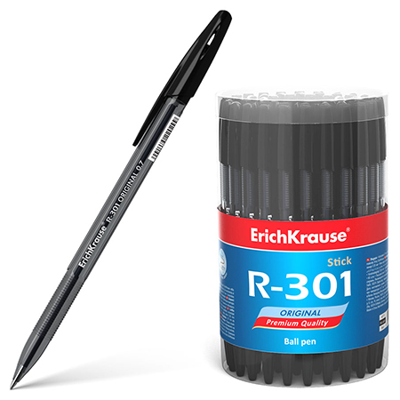 Ручка шариковая " Erich Krause " R-301 Original Stick черная 0,7мм, шестигранная, рифленый держатель, прозрачный корпус, в пластиковом тубусе