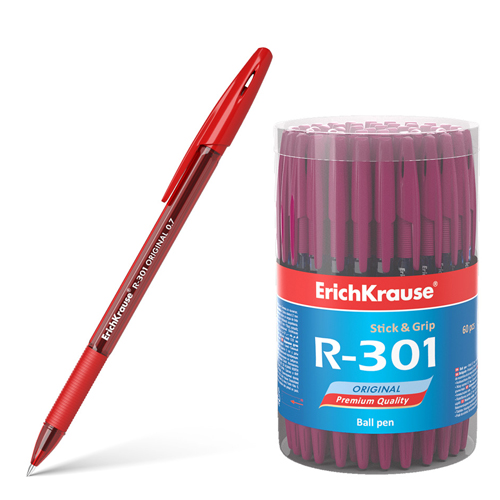 Ручка шариковая " Erich Krause " R-301 Original Stick&Grip красная 0,7мм, шестигранная, резиновый держатель, тонированный корпус, толщина письма 0,35мм, в пластиковом тубусе