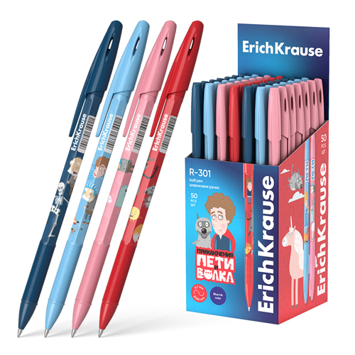 Ручка шариковая " Erich Krause " R-301 Stick&Grip Приключения Пети и Волка синяя 0,7мм, шестигранная, рифленный держатель, цветной корпус- ассорти, толщина письма 0,35мм, пакет, европодвес