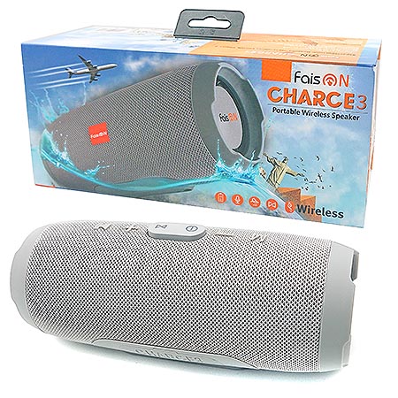 Колонка портативная " FaisON " Charge 3 серая, беспроводная, пластик, Bluetooth, AUX, USB, кабель Jack 3,5мм, кабель для зарядки USB, 20Вт, 90*210мм
