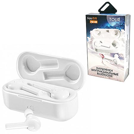 Наушники " FaisON " TW-08 белые, внутриканальные, беспроводные, Bluetooth 5.0, кабель для зарядки USB, футляр 35*80мм
