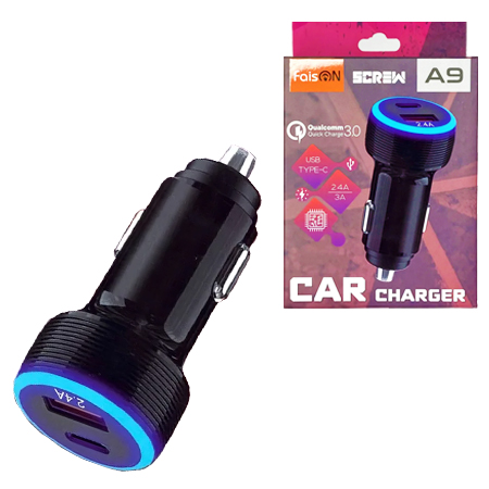 Блок питания автомобильный " FaisON " A9 Screw черное, 2,4А, USB, Type-C, QC3.0, пластик (кабель в комплект не входит)