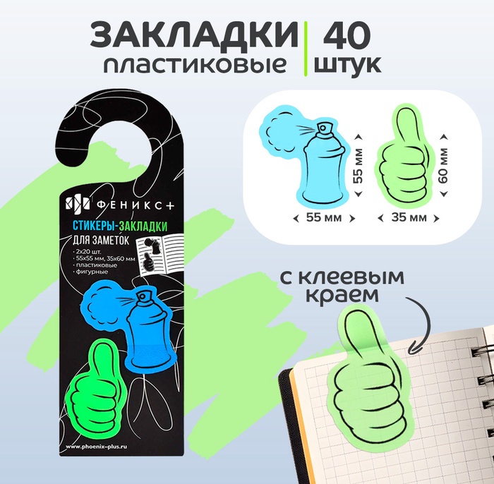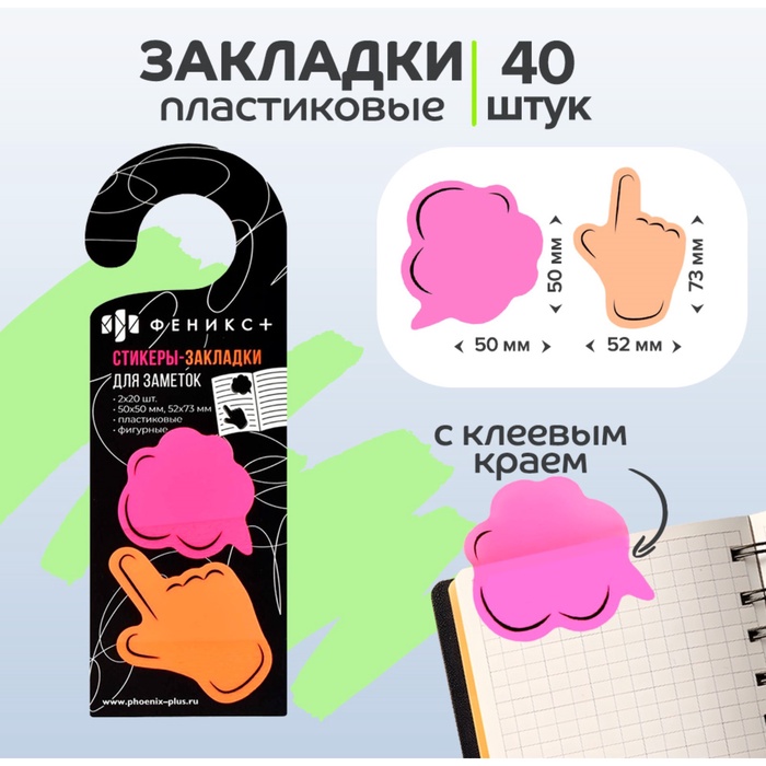 Закладки с клеевым краем пластиковые 50 х 50 мм, 52 х 73 мм, 2 цвета по 20 листов, на подложке, Феникс