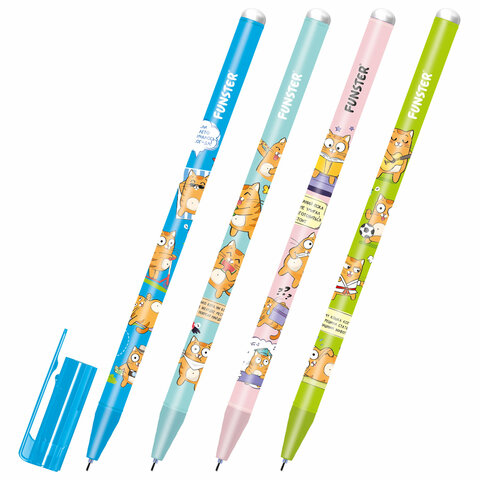 Ручка стираемая гелевая с принтом FUNSTER "КОТ-ЭНТУЗИАСТ", СИНЯЯ, корпус ассорти, игольчатый наконечник 0,5 мм, линия 0,35 мм, 144414