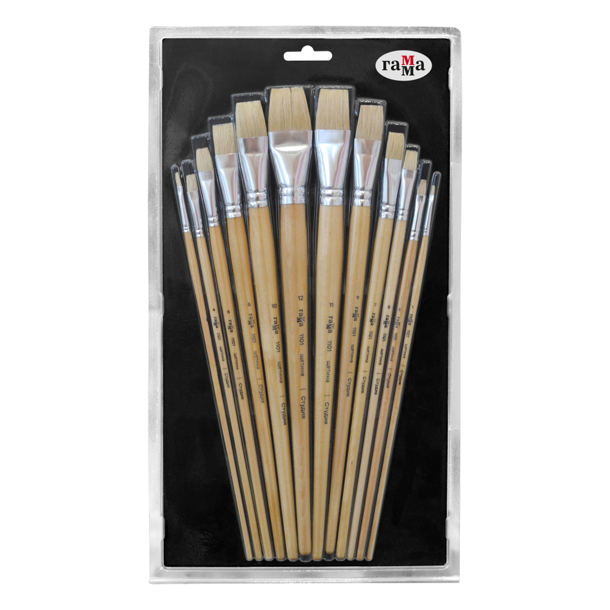 Набор художественных кистей щетина Гамма "Студия", 12шт., плоские №1, 2, 3, 4, 5, 6, 7, 8, 9, 10, 11, 12