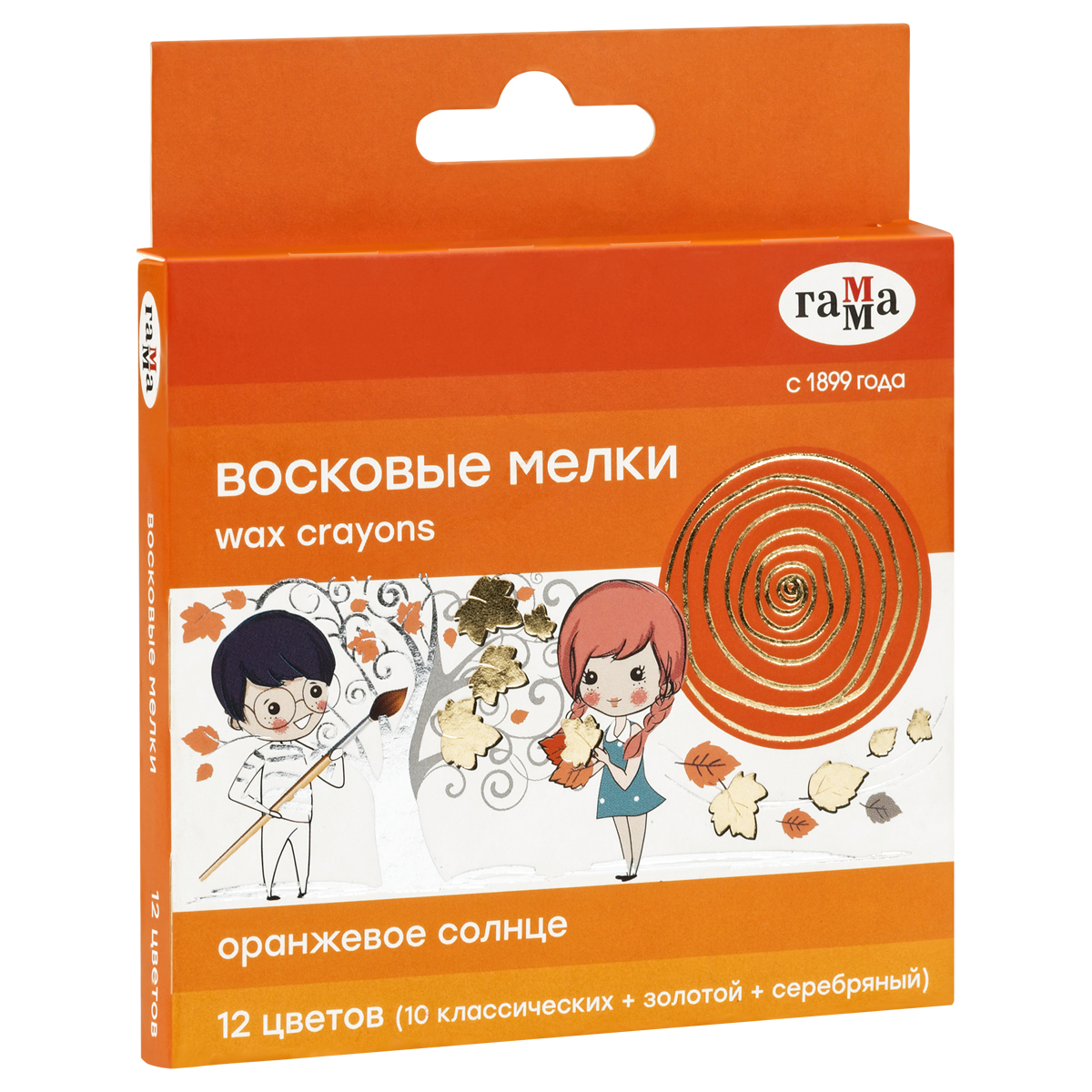 Мелки восковые Гамма "Оранжевое солнце", 12цв., (классич. + золото + серебро), круглые, картон. упаковка, европодвес