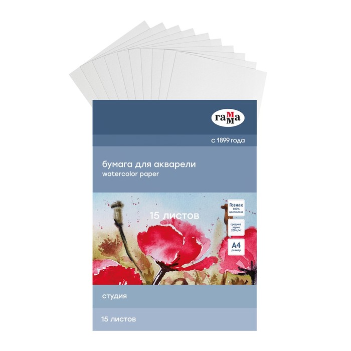 Бумага для акварели в папке А4, 15 листов, Гамма "Студия", 200 г/м2, среднее зерно