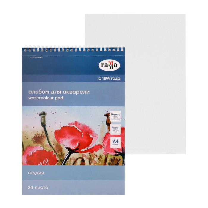Альбом для Акварели А4 (210 х 297 мм), 200 г/м2, 24 листа, "Гамма. Студия", на гребне, среднее зерно
