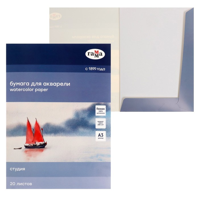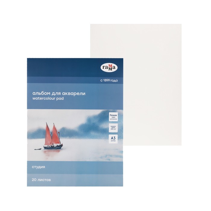 Альбом для Акварели А3 20 листов, 200 гм/2, Гамма "Студия", на склейке, среднее зерно (30C01G720W)