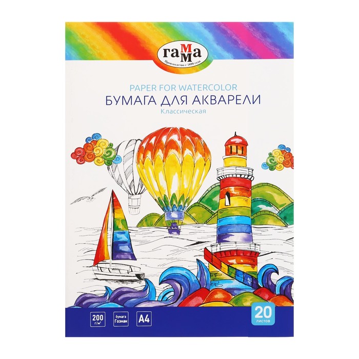 Бумага для акварели А4 20 листов, 200 г/м2, "Классическая" Гамма, в папке, 180523_А420020