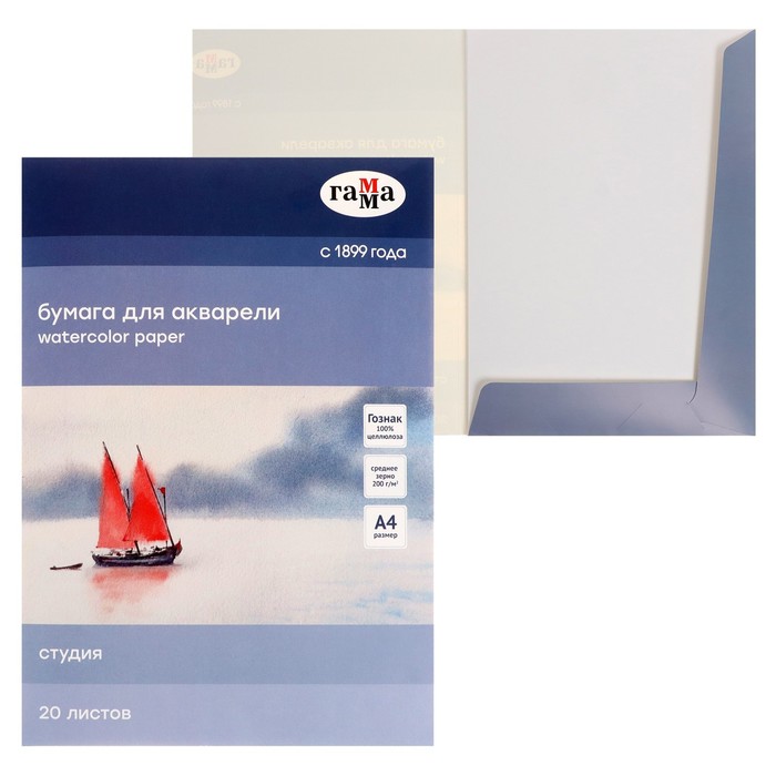 Бумага для акварели в папке А4, 205 x 296 мм, 20 листов, Гамма "Студия", 200 г/м2, среднее зерно (40C03F720W)