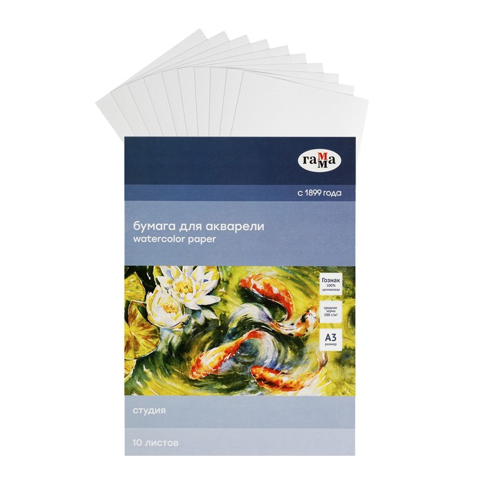 Бумага для акварели в папке А3, 10 листов, Гамма "Студия", 200 г/м2, среднее зерно