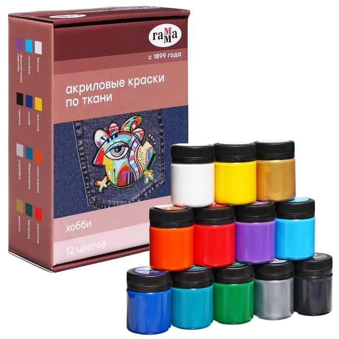 Краска по ткани акриловая, набор 12 цветов х 20 мл Гамма "Хобби" 100712