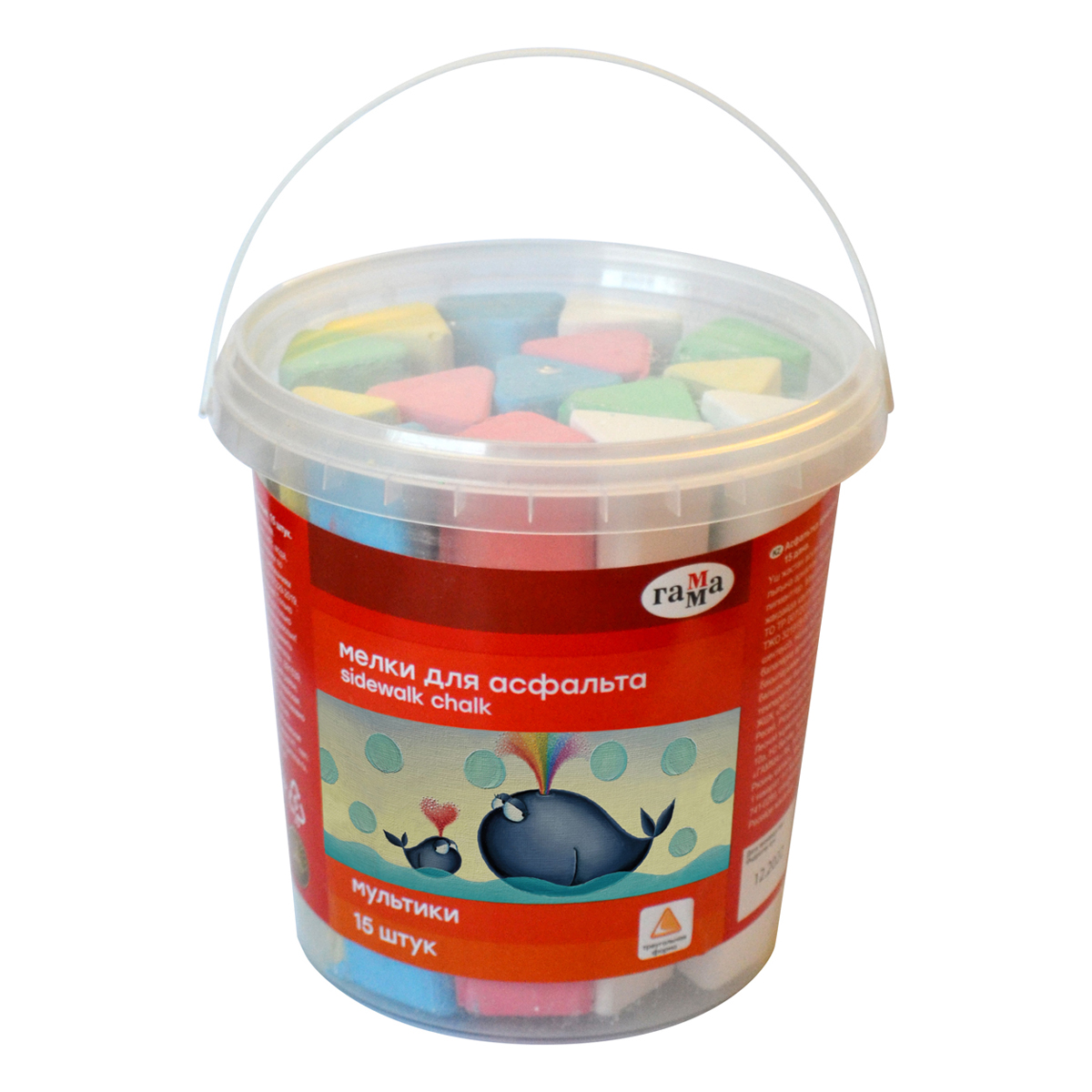 Мелки для асфальта Гамма "Мультики", цветные, 15шт., треугольные, пластиковое ведро