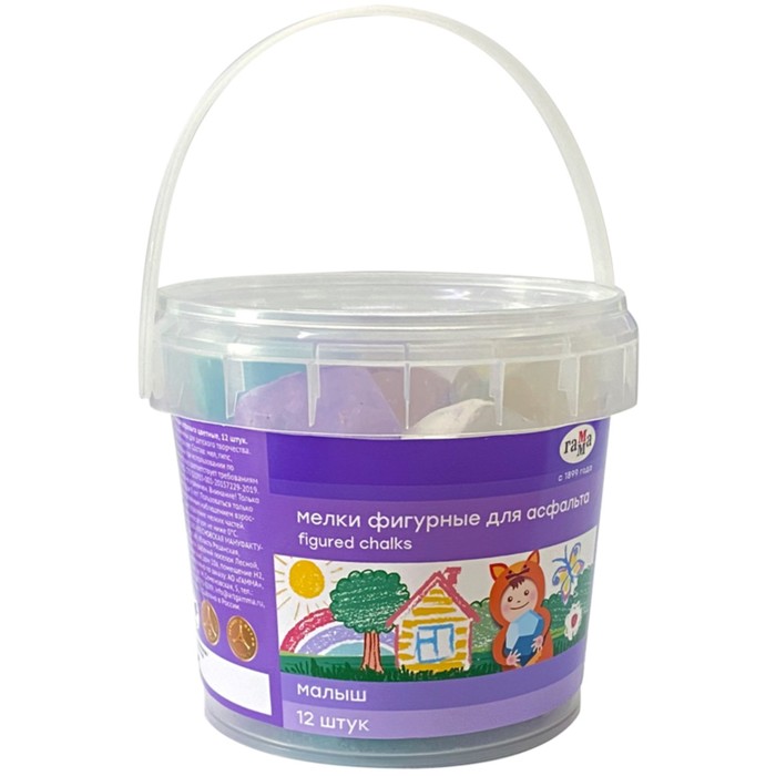 Мелки цветные для асфальта 12 штук Гамма "Малыш", фигурные камешки, пластиковое ведро (323082)