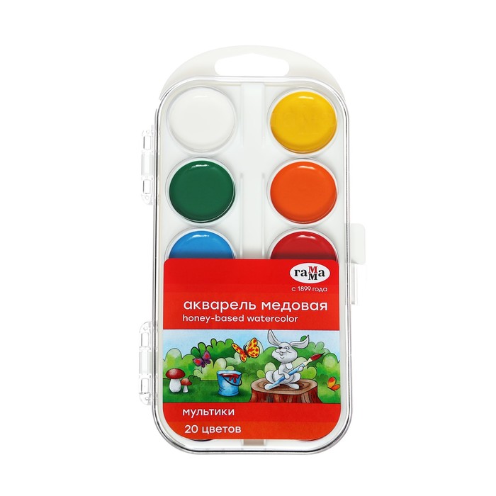 Акварель 20 цветов, «Гамма» «Мультики», без кисти, в пластиковой коробке