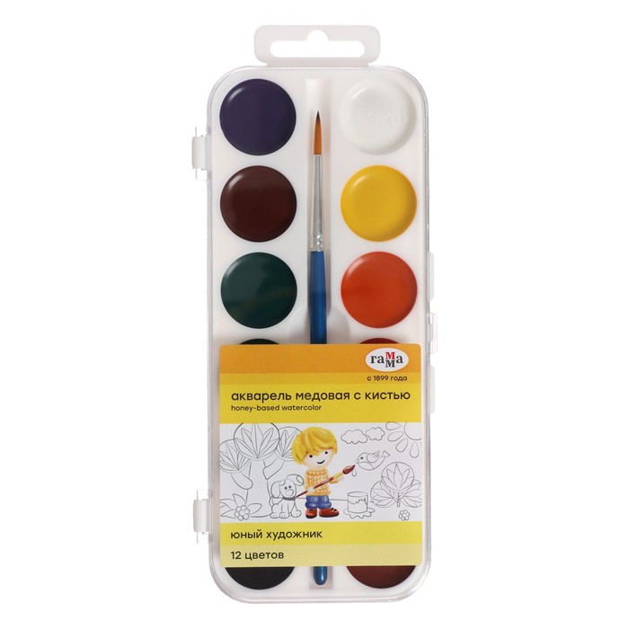 Акварель 12 цветов "Гамма" "Юный художник", медовая, с кистью, пластик