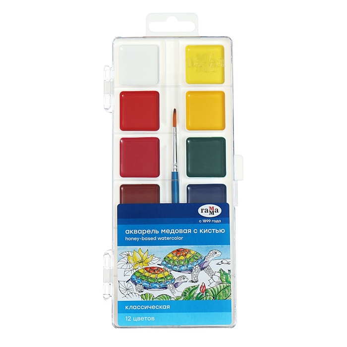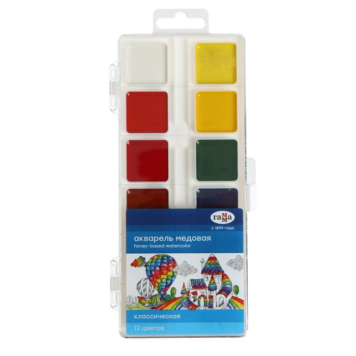 Акварель 12 цветов "Гамма" "Классическая", медовая, без кисти, пластик