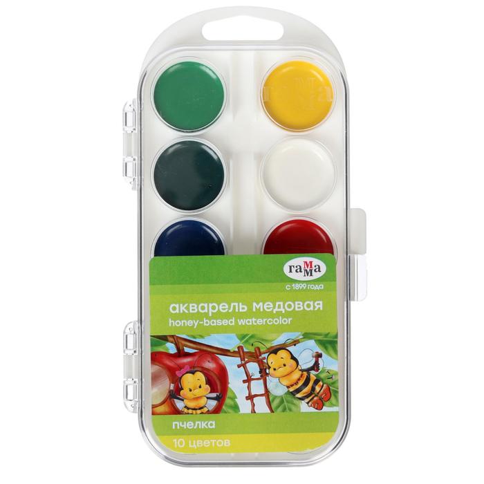 Акварель 10 цветов "Гамма" "Пчёлка", медовая, без кисти, пластик