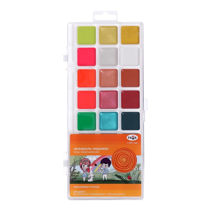 Акварель 24 цвета (8 перламутр. + 8 флуор. + 8 классич.) Гамма "Оранжевое солнце", медовая, без кисти, пластик, европодвес 291020209