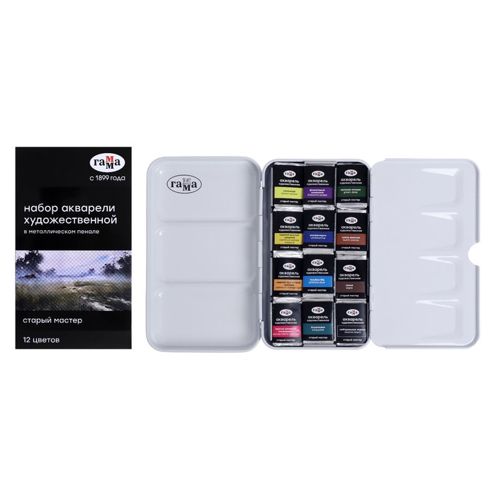 Акварель художественная в кюветах, 12 цветов х 2.6 мл, Гамма "Старый Мастер", металлический пенал, 200622_0112