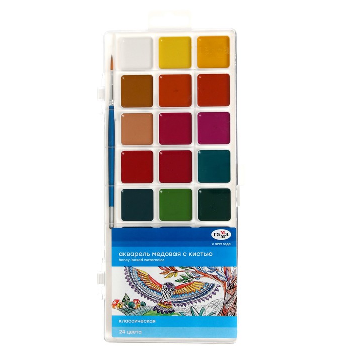 Акварель 24 цвета "Гамма" "Классическая", медовая, с кистью, пластик