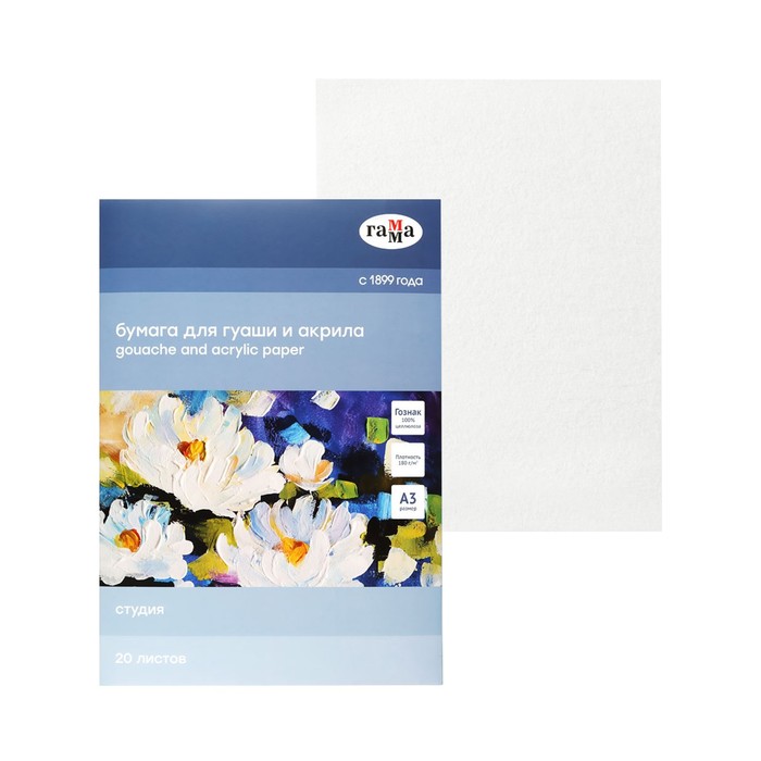 Бумага для акрила и гуаши в папке А3, 20 листов, Гамма "Студия", 180 г/м2