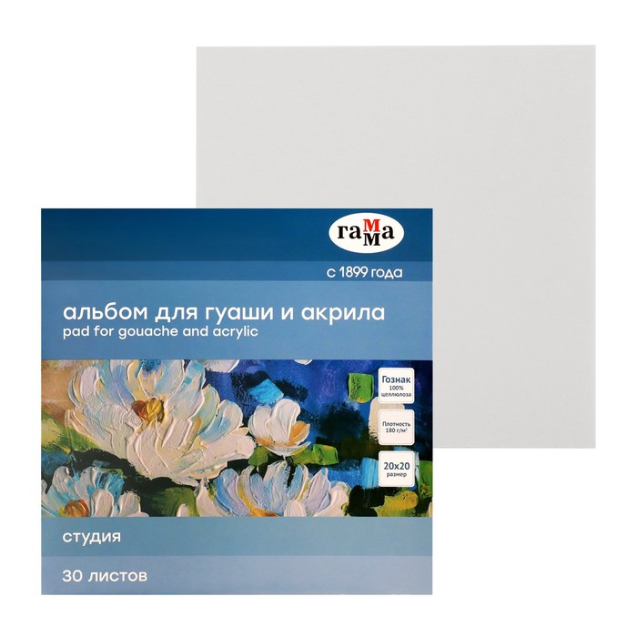 Альбом для акрила и гуаши 200 х 200 мм, 30 листов, 180г/м2, "Гамма. Студия", склейка