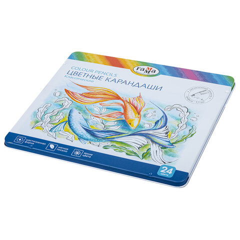 Карандаши цветные ГАММА "Классические", 24 цвета, металлический пенал, шестигранные, грифель 3,3 мм, натуральное дерево, 80220214