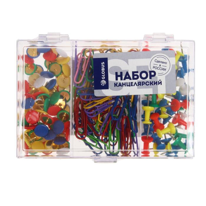 Набор канцелярский из 3-х предметов (скрепки 28 мм цветные - 70 шт, кнопки силовые цветные - 40 шт, кнопки цветные - 70 шт.)