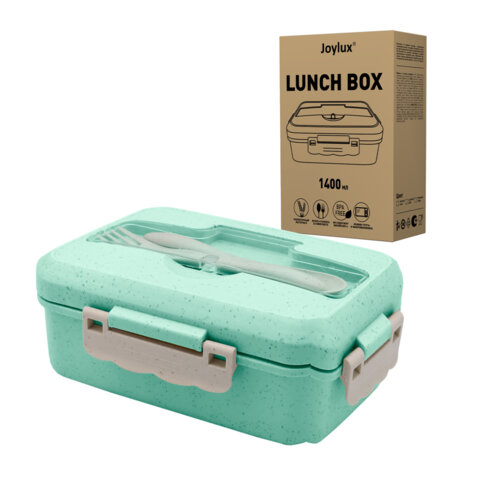 Ланч-бокс контейнер 2 секции 3+1 отделение 1,4л ложка, вилка 7х21х14см, мятный JOYLUX, 609347