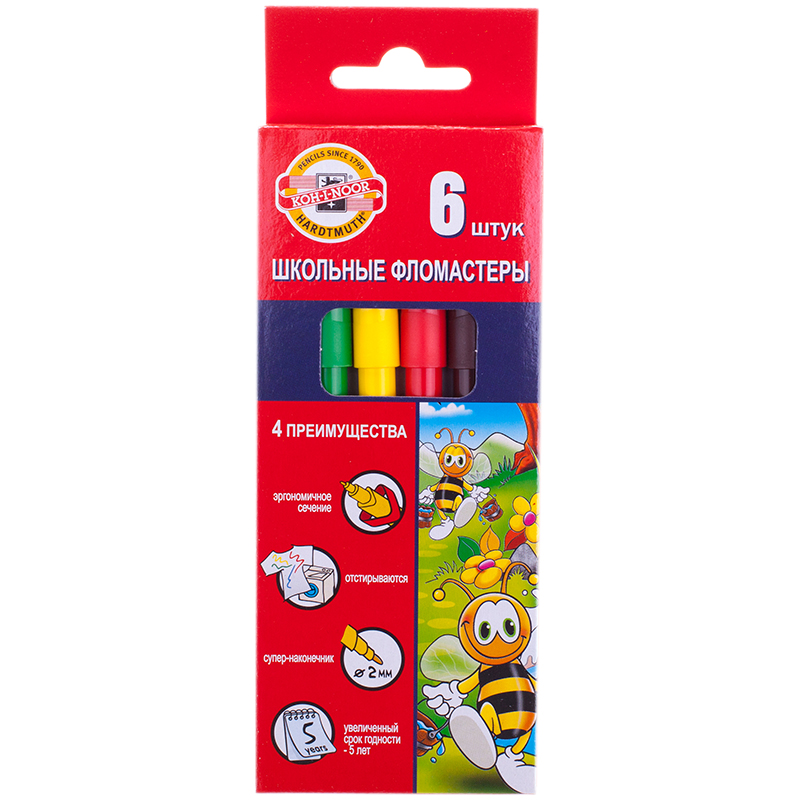 Фломастеры Koh-I-Noor "Пчелка", 06цв., трехгранные, смываемые, картон, европодвес