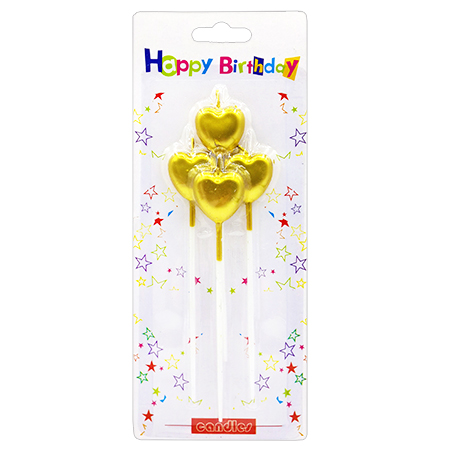 Набор свечей для торта " Happy Birthday " Золотые сердечки 4шт, 3*2,5*1см, на палочке, картонный блистер 24*9,5*2см, европодвес