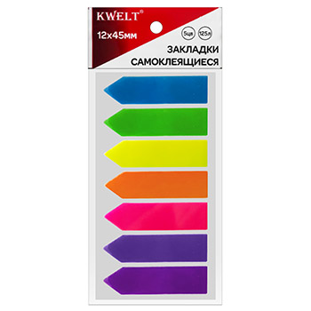 Закладки самоклеящиеся " KWELT " Стрелки 12*45мм 7цв*25л неон пластик, индивидуальная упаковка, европодвес