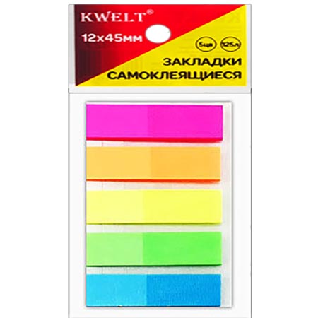 Закладки самоклеящиеся " KWELT " 12*45мм 5цв*25л неон пластик, пластиковая книжка, индивидуальная упаковка, европодвес