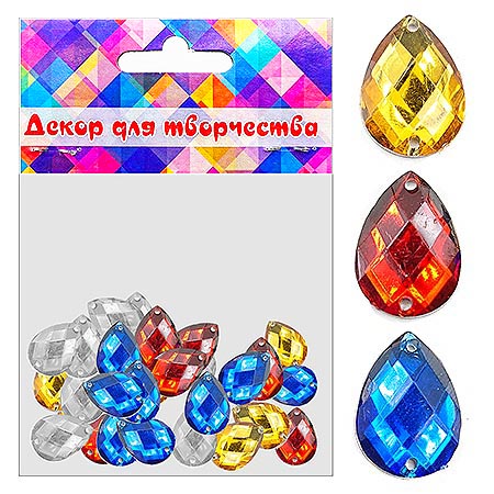 Стразы декоративные Капелька 40шт 1,5*1см, ассорти, цветной пластик, отверстие для пришивания, пакет, европодвес