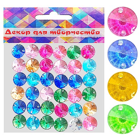 Стразы декоративные Круг 40шт 12мм, ассорти, цветной пластик, отверстия для пришивания, пакет, европодвес